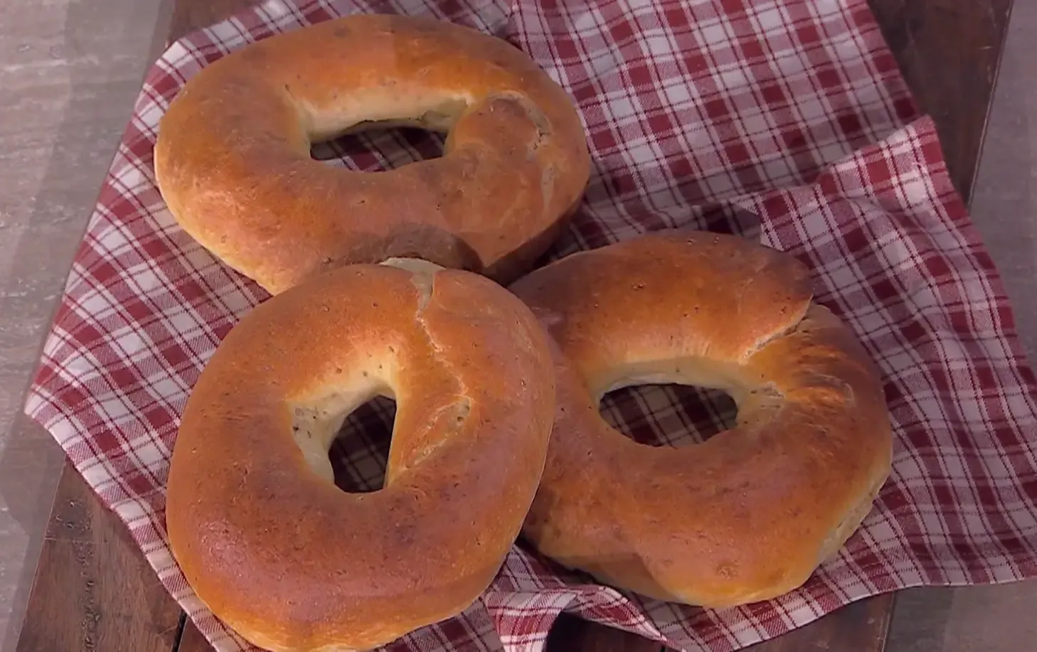 Dividiamo l’impasto in 5-6 parti uguali. Ripieghiamo ciascun panetto su se stesso, formando dei filoncini leggermente allungati. Li assottigliamo e li chiudiamo a ciambella. Disponiamo quest’ultime su una teglia, distanziate, le copriamo e le lasciamo lievitare fino al raddoppio a temperatura ambiente. Pratichiamo delle incisioni in superficie e cuociamo in forno caldo e statico a 200° C per 30 minuti.
